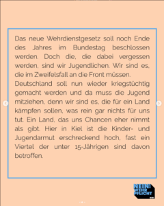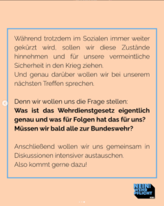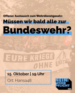 Müssen wir bald alle zur Bundeswehr? Diese Frage wollen wir uns am 15.10 gemeinsam mit euch stellen! Denn noch dieses Jahr soll das neue Wehrdienstgesetz im Bundestag beschlossen werden. Doch dabei soll es nicht bleiben. Die CDU, vor allem Außenminister Wadephul, befürwortet eine sofortige Wehrpflicht.