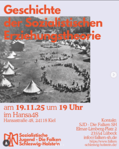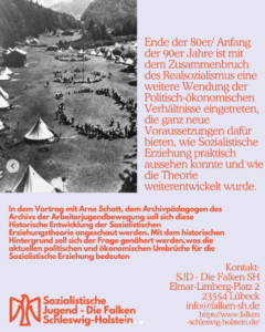 In dem Vortrag mit Arne Schott vom Arbeiterjugendbewegung soll sich diese Historische Entwicklung der Sozialistischen Erziehungstheorie angeschaut werden. Mit diesem historischen Hintergrund soll sich der Frage genähert werden, welche was die aktuellen politischen und Ökonomischen Umbrüche für die Sozialistische Erziehung bedeuten.