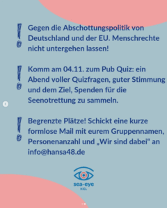 Kommt am 04.11. zum Pub Quiz, das Sea-Eye veranstaltet, um auf die humanitäre Krise im Mittelmeer aufmerksam zu machen. Euch erwartet ein Abend voller Quizfragen, guter Stimmung und dem Ziel, Spenden für die Seenotrettung zu sammeln.