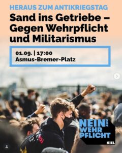 Wir, ein Bündnis aus verschiedenen Jugendorganisationen, stellen uns dagegen. Wir sagen: Nein zur Wehrpflicht! Lasst uns diesen Protest wieder auf die Straße tragen am 1. September, dem Antikriegstag, und die Wiedereinführung der Wehrpflicht verhindern!