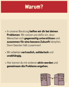 Wir setzen uns dafür ein, dass Menschen sich gegenseitig unterstützen und zusammenarbeiten für eine bessere Zukunft. In unserer Beratung helfen wir dir bei deinen Problemen und wir möchten dich ermutigen, auch selbst aktiv zu werden. Bei uns kannst du Verbündete finden und gegen die Probleme kämpfen.