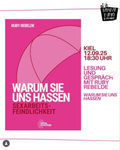 „Warum sie uns hassen – Sexarbeitsfeindlichkeit“. Wir freuen uns sehr auf eine Lesung, die nicht nur Wissen vermittelt, sondern uns alle herausfordert, Position zu beziehen.